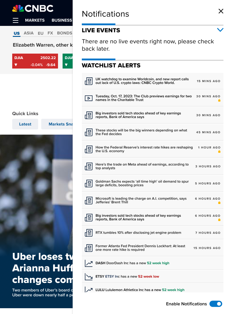 A side drawer was chosen for the notification area instead of a dropdown or a modal. This was done to future-proof the design because the drawer's size stays the same no matter if the user has a few alerts or many. Also, the side drawer was chosen because it's already a standard component used across the entire CNBC platform.